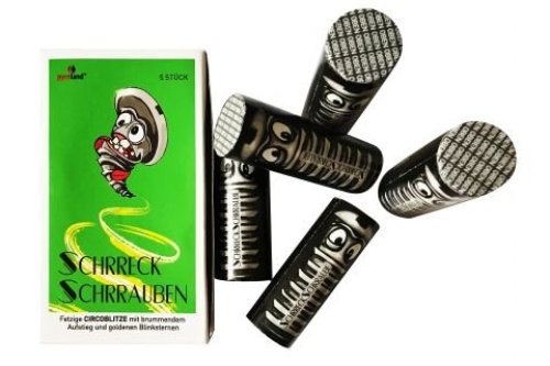 Unsere Schrreckschrrauben stellt man aufrecht auf den Boden, zündet sie an und …. und dann schrrrrrrauben sie sich mit einem witzigen Brummton frech nach oben in die Lüfte. Da diese sogenannten Circoblitze in unseren Breitengraden keinen Knall haben dürfen, haben wir unseren Schrreckschrrauben noch ein kleines Goldblinker-Schüttbukett spendiert.