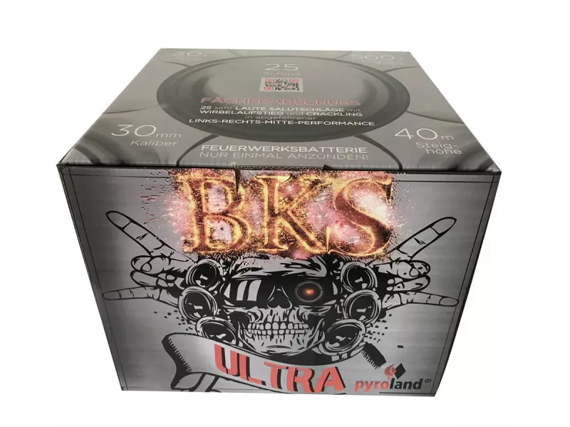 PYROLAND präsentiert BKS ULTRA, diese Batterie schnürt starke Salutschläge, abgefahrene Performance, gleißende Titanwirbel und fetziges Crackling zu einem Gesamtpaket, welches sich gewaschen hat!